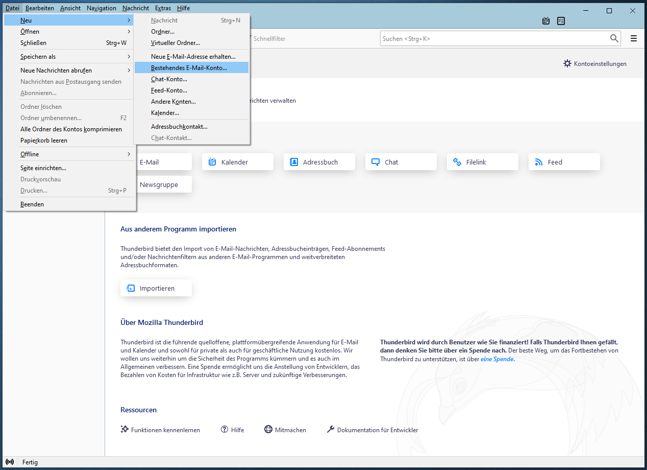 Oder über das Menü Datei > Neu > Bestehendes E-Mail Konto….