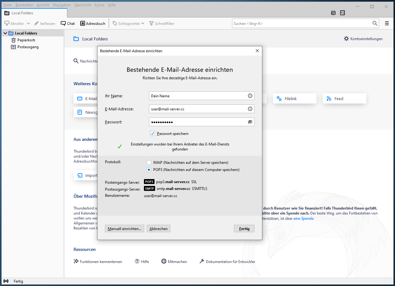 Wurden Benutzername und Passwort korrekt eingegeben, erkennt Thunderbird automatisch die korrekten Server Einstellungen.